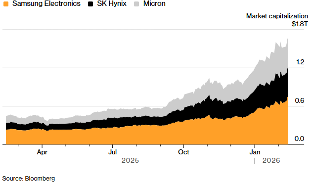 - ETF creado y lanzado en la pandemia para tener exposición al sector (similar al SOXX de EEUU) Algunas de las principales posiciones que tiene son de Nvidia, Micron, Applied Materials, Lam o Intel entre otros. Debajo vemos como entre Samsung, SK y Micron han superado el trillón de capitalización de mercado durantelos últimos meses.