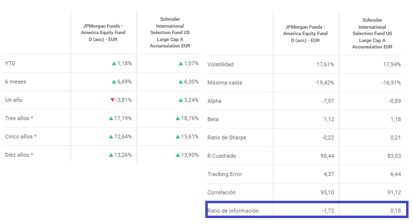 Como vemos debajo, el de Schroder ha tenido más rentabilidad a 1, 3 y 5 años en este caso comparado con el de JPM, gracias a una gestión más eficiente con un drawdown menor, mayor ratio de Sharpe y positivo Ratio de Información