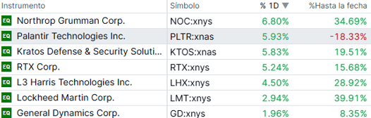 Compañías del sector defensa experimentan subidas también ya que se espera un aumento en el gasto militar y contratos gubernamentales. En particular, compañías USA como Lockheed Martin, RTX o Northrop Grumman han hecho máximos históricos durante las últimas horas.