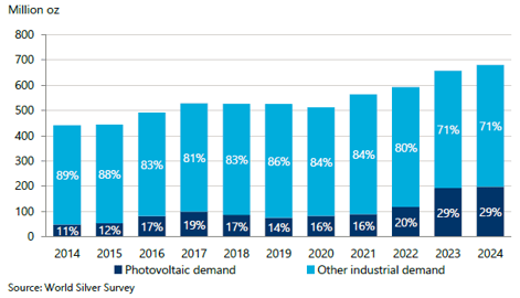 Transición energética: La expansión de energías renovables y electrificación del transporte demanda enormes cantidades de plata para células solares, contactos eléctricos y baterías.