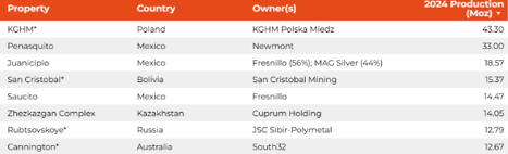 Buena parte de las reservas están en Latinoamérica, Polonia y otras partes de Asia como en Rusia y Australia. Las mayores empresas de minería asociadas a la producción de plata, ya sea como metal principal o subproducto, incluyen las siguientes, la mayor parte de ellas cotizadas en la bolsa de Londres, Canadá o EEUU.