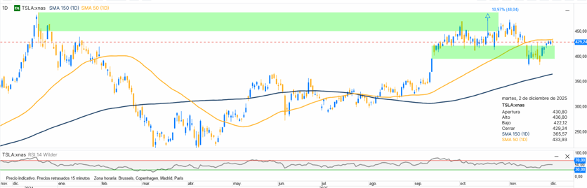 Tesla no es solo un fabricante de vehículos eléctricos. Su negocio se apoya cada vez más en la IA aplicada a la conducción autónoma (FSD), la robótica (Optimus), la gestión energética y el almacenamiento. Es una empresa de alto potencial, pero también de elevada volatilidad, adecuada para perfiles con tolerancia al riesgo. La compañía de Elon Musk vivió un 2025 complicado: fuerte caída inicial, largo tramo lateral y potente ruptura alcista desde septiembre. Parece que las cosas pueden mejorar en 2026.