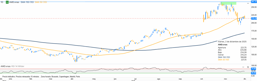 Advanced Micro Devices, se ha consolidado como uno de los grandes competidores de Nvidia en el mercado de chips de IA. Su fortaleza se basa en la diversificación: centros de datos, inteligencia artificial, ordenadores personales y servidores. A pesar de cotizar a múltiplos exigentes, su crecimiento justifica gran parte de esta valoración. AMD completó un giro alcista claro tras marcar mínimos en primavera, superando medias clave y encadenando máximos crecientes hasta otoño. La corrección reciente apoya sobre la SMA 50, manteniendo estructura positiva mientras no pierda la zona de 200 $ como soporte decisivo.