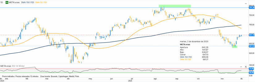 Meta está realizando una de las mayores inversiones en IA de todo el sector tecnológico. Su liderazgo en redes sociales le da una ventaja única para monetizar la IA en publicidad, contenidos y, a largo plazo, en el desarrollo del metaverso. Tras importantes correcciones, vuelve a ser atractiva para el inversor de largo plazo. Meta mostró fuerte tendencia alcista gran parte del año, marcando máximos históricos en verano, seguida de corrección profunda hasta la zona 590 y rebote técnico. Para 2026, mientras recupere la SMA 150, el sesgo seguirá alcista con potencial de recuperación.
