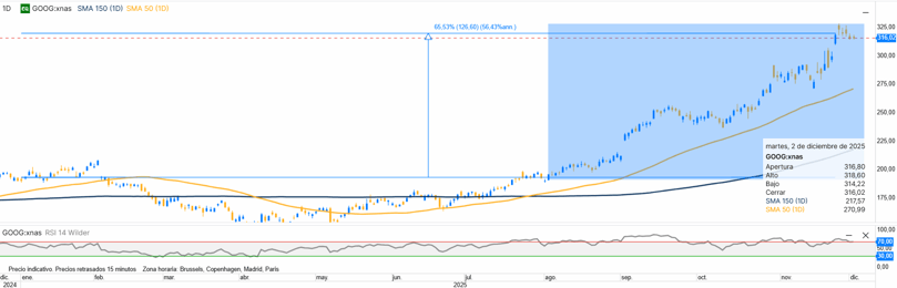 Google ha recuperado protagonismo en la carrera de la IA con el desarrollo de Gemini y su enorme capacidad de procesamiento. Además, domina el mercado de búsquedas, posee Android, YouTube y desarrolla sus propios chips de IA, lo que refuerza su control sobre toda la cadena de valor. Google confirmó un sólido cambio de tendencia desde primavera, rompiendo resistencias y acelerando hasta nuevos máximos históricos sobre la SMA 50 y 150. Para 2026, mientras consolide sobre 300 dólares, el escenario base sigue siendo alcista con proyección de continuidad.
