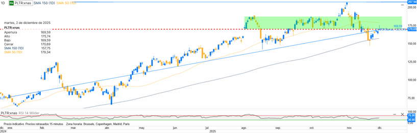 Especializada en análisis de datos e inteligencia artificial aplicada a gobiernos y grandes corporaciones, Palantir destaca por su fuerte crecimiento y su alta rentabilidad operativa. Sin embargo, su elevada valoración exige prudencia al entrar. Mantuvo tendencia alcista gran parte del año, con aceleración en verano, consolidación lateral y corrección controlada en otoño. El precio respeta directriz de largo plazo. Para 2026, superar 180 reabriría subida; perder 155 activaría escenario correctivo de medio plazo.