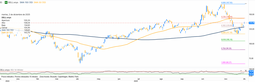 Más allá de su negocio clásico de ordenadores, Dell se ha convertido en un proveedor clave de servidores optimizados para IA. Su valoración es especialmente atractiva en comparación con otras compañías del sector, lo que la hace interesante para perfiles más conservadores. El valor está cerrando un año de recuperación progresiva tras fuertes mínimos, con tendencia alcista ordenada y corrección técnica en el último tramo. Para 2026, mientras mantenga la zona 125–130, el sesgo seguirá constructivo con posible ataque a los máximos anuales.