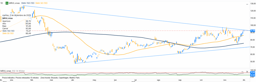Marvell se ha especializado en el desarrollo de chips personalizados para IA, principalmente para centros de datos y grandes operadores tecnológicos. Aunque compite con gigantes como Broadcom, su nicho de soluciones a medida le da un fuerte potencial de crecimiento. Marvell vivió un año de transición: fuerte caída inicial, suelo en primavera y posterior recuperación dentro de un canal ascendente de medio plazo. Para 2026, la superación de 95 confirmaría tramo alcista adicional; perder 70 reactivaría presiones bajistas.