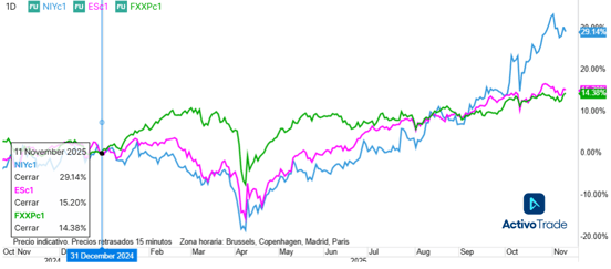 Dicho índice acumula una subida cercana al +30% en 2025 (arriba) y dobla en rentabilidad desde principios de año al Stoxx 600 o S&P 500 a modo de ejemplo habiendo rebotado más fuerte de los mínimos del pasado mes de abril.