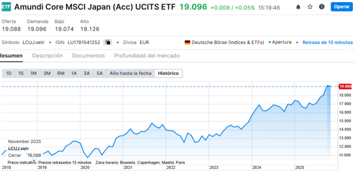 - Amundi Core MSCI Japan UCITS ETF (LCUJ) es un ETF cotizado en euros en la bolsa de Alemania que reinvierte en el mismo los dividendos cobrados (Acc) y siendo uno de los ETFs con más patrimonio que invierten en el país (> 4.000 millones de euros) En este caso no tiene la divisa cubierta y sus mayores posiciones son Toyota, Mitsubishi, Sony o Hitachi.