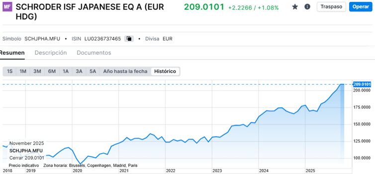 SCHRODER ISF JAPANESE EQUITY A EURHDG (ACC) Es un Fondo de Inversión de la gestora Schroder, de acumulación. Esta clase es en euros (pero con la DIVISA CUBIERTA) de ahí la mayor rentabilidad acumulada durante los últimos años para inversores europeos en el mismo. Sus mayores posiciones son del sector tecnológico, financiero y químico con algunas de las mayores posiciones del mismo en la derecha.