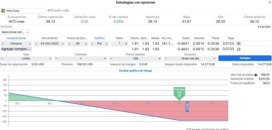 En el ejemplo debajo simularmos una orden compra de 1 PUT de acciones de Intel (recordemos que el tamaño del contrato en opciones de compañías son 100 títulos) a un precio inferior del de mercado (Precio strike o de ejercicio en 38 $) a un vencimiento hasta el viernes pagando por ello una prima de 188 $ y siendo el punto de equilibrio o break even en 36.12 $ (momento a partir del cual gano dinero si el precio de la compañía en este caso siguiera cayendo, a un 5,2% de los precios de mercado actuales)