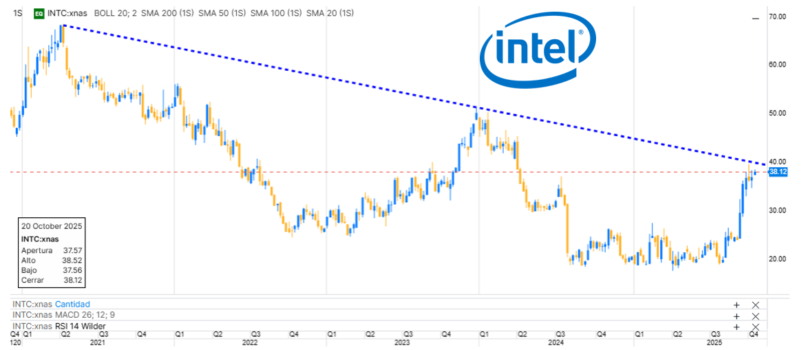 La compañía de PCs y semiconductores es la que más ha subido durante el último mes junto a AMD, tras importantes acuerdos con Nvidia o el gobierno de EEUU conocidos durante las últimas semanas. Presenta resultados del tercer trimestre mañana por la noche.
