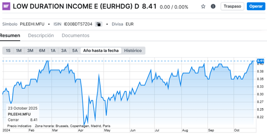 PIMCO Low Duration Income E (EURHDG) (IE00BDT57Z04) es un fondo de Renta Fija a corto plazo (más del 50% de su cartera está invertido en bonos con duración a 1-3 años) Diversificado por sectores con mayor exposición a Banca, Tecnología o Utilities y con mejores ratios en comparación a la competencia (Sharpe a 3 años 0.95 / Información 1.26)