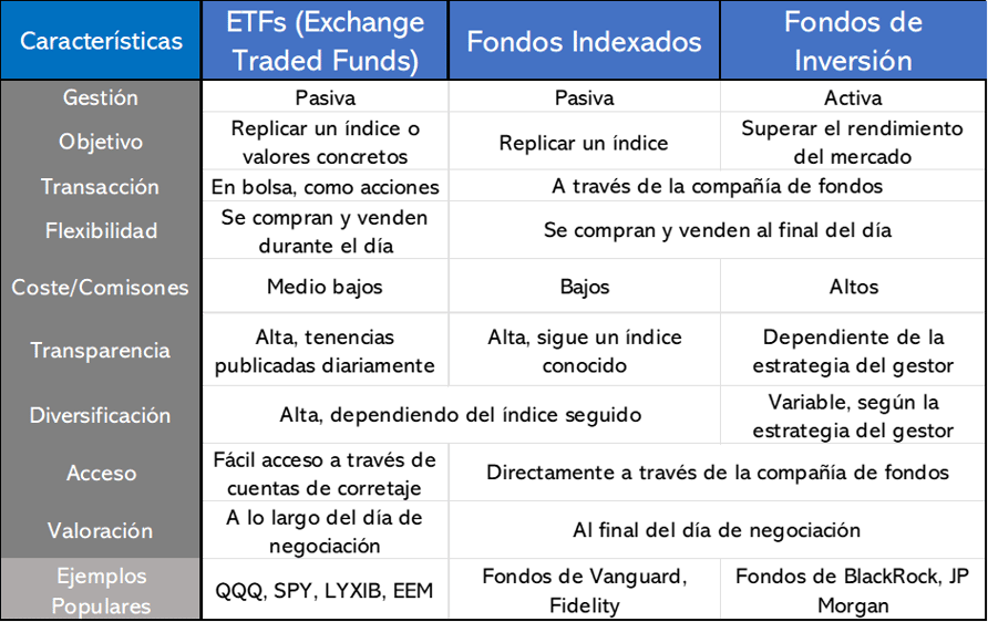 - Gastos operativos menores - Normalmente tienen comisiones más bajas que los fondos de inversión tradicionales, haciendo hincapié en la gestión pasiva y sin necesidad de control diario.